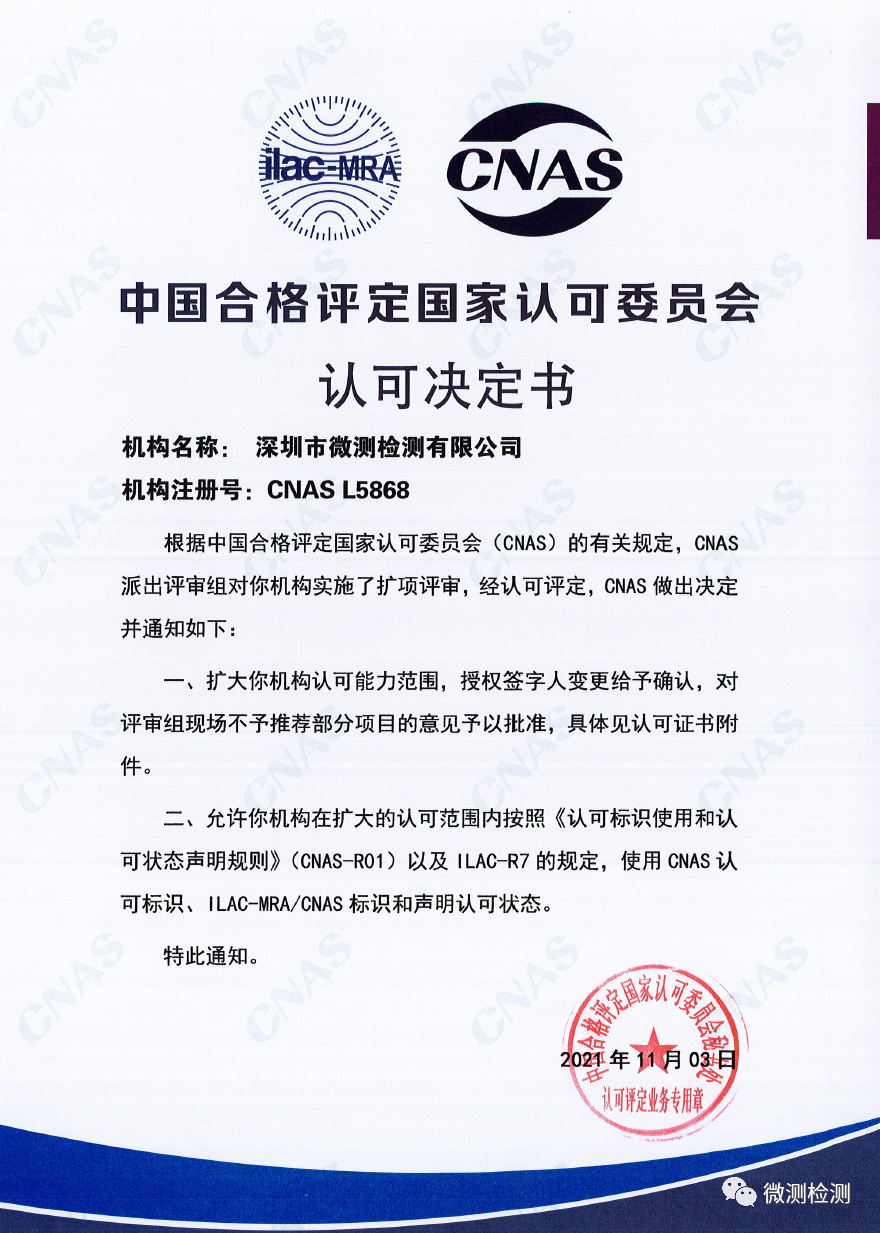 喜訊!微測檢測順利通過CNAS擴項評審,并于2021年11月初收到了中國合格評定國家認可委員會(以下簡稱“CNAS”)擴項認可決定書。